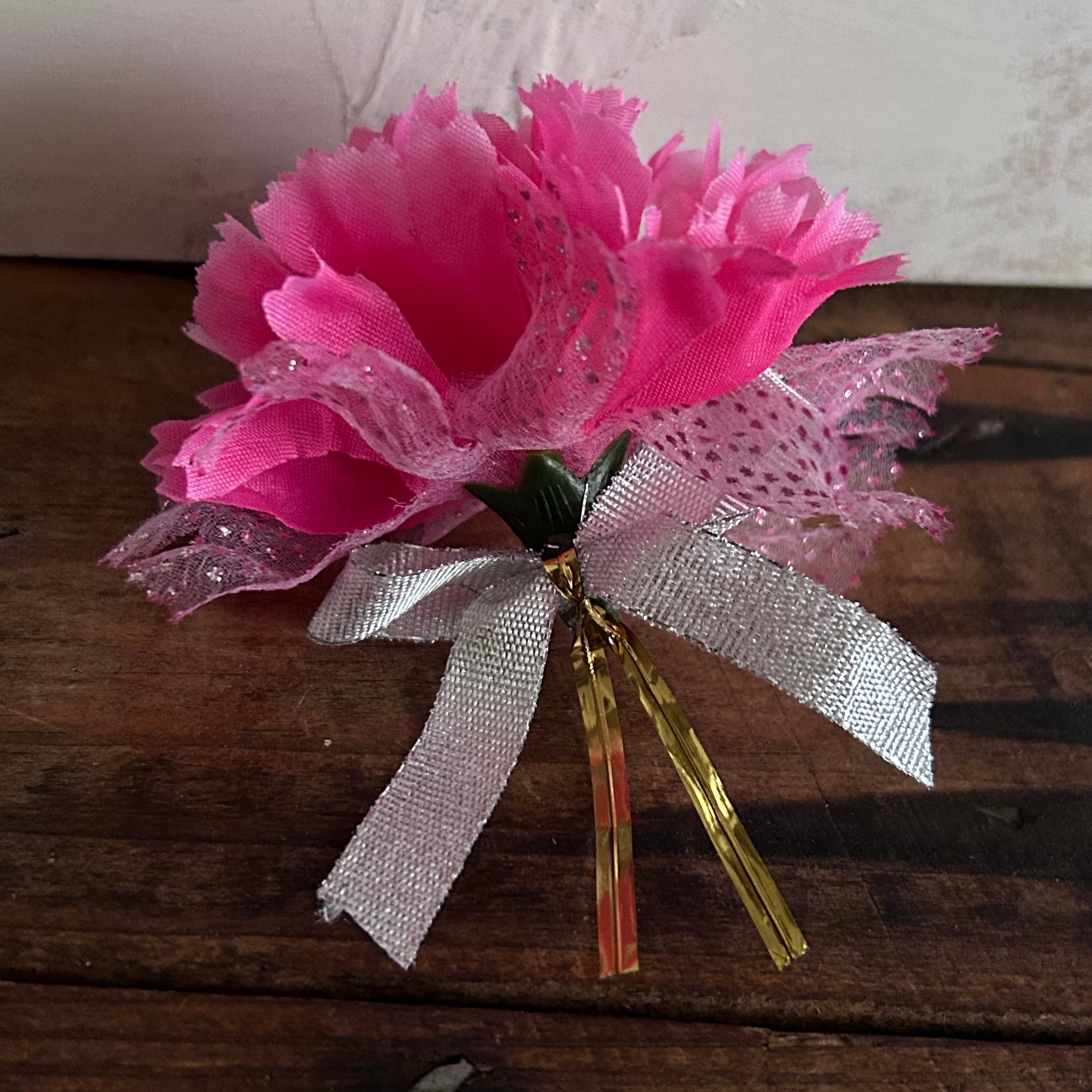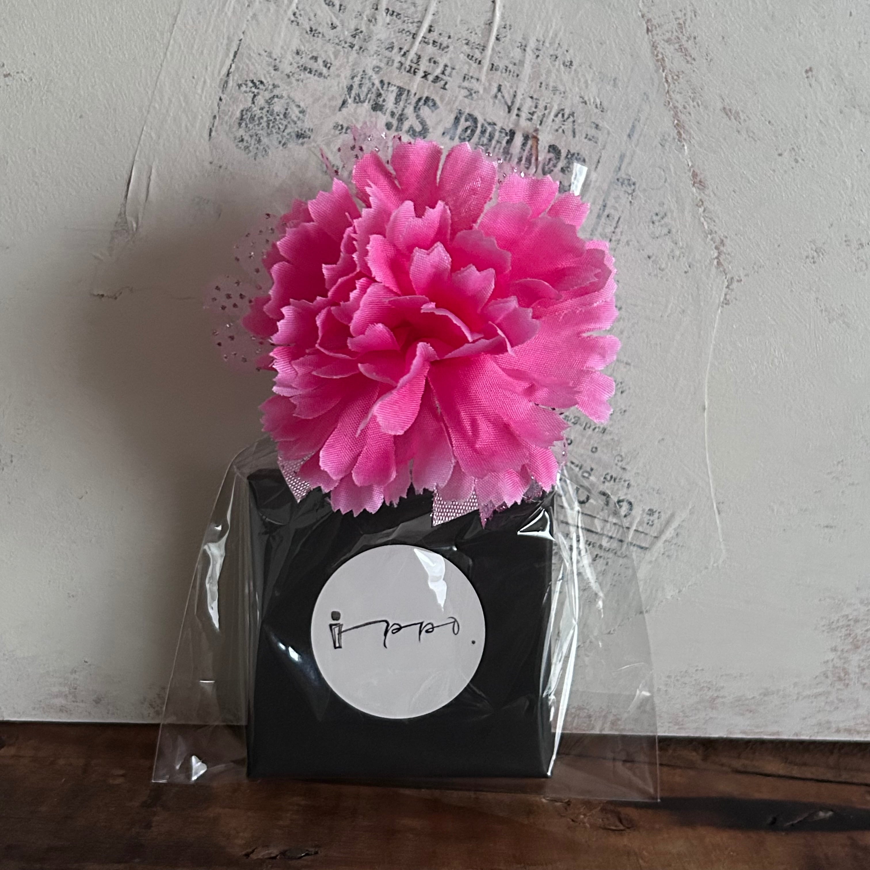 透明の袋、カーネーションがついたリボン、