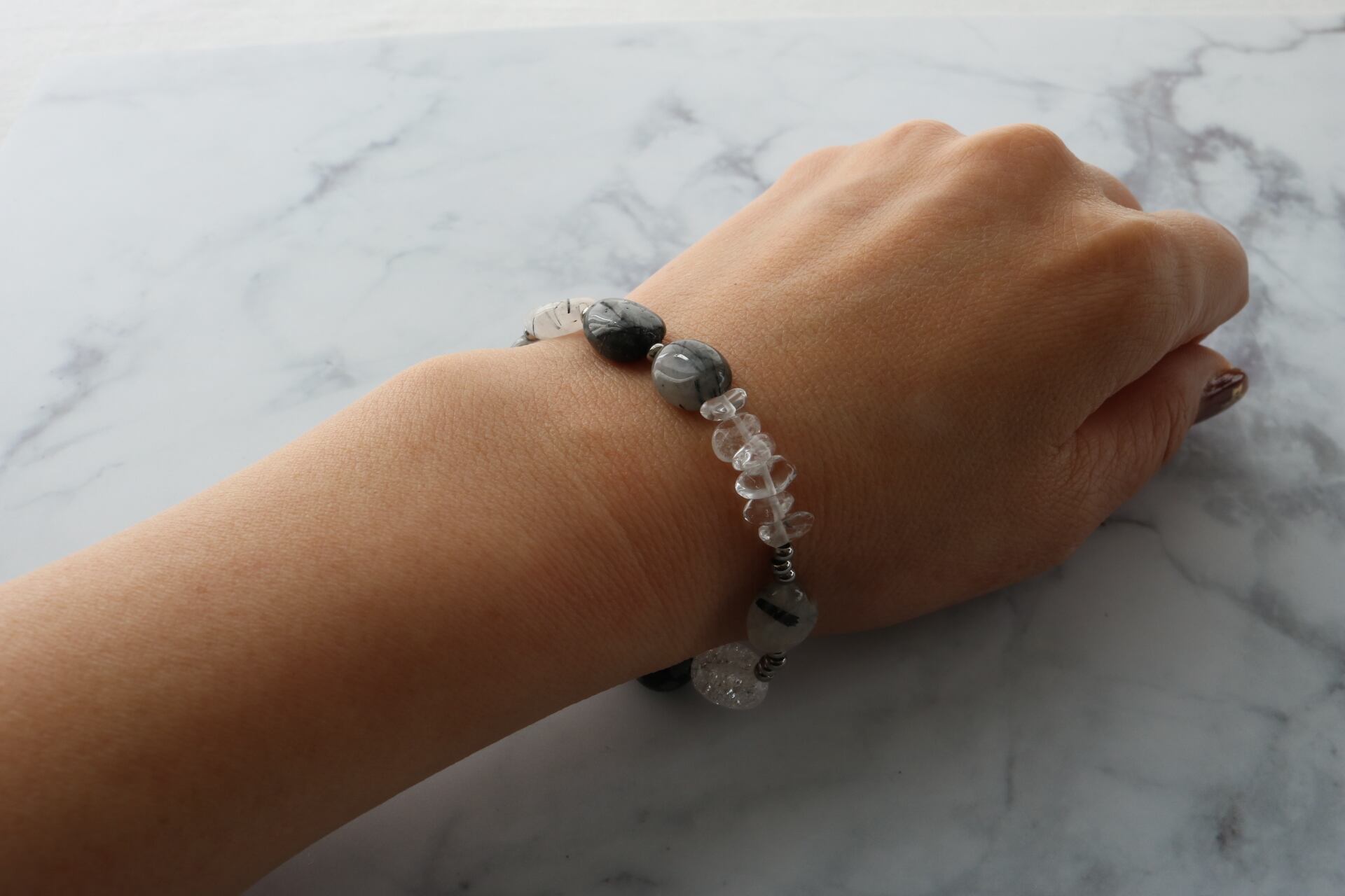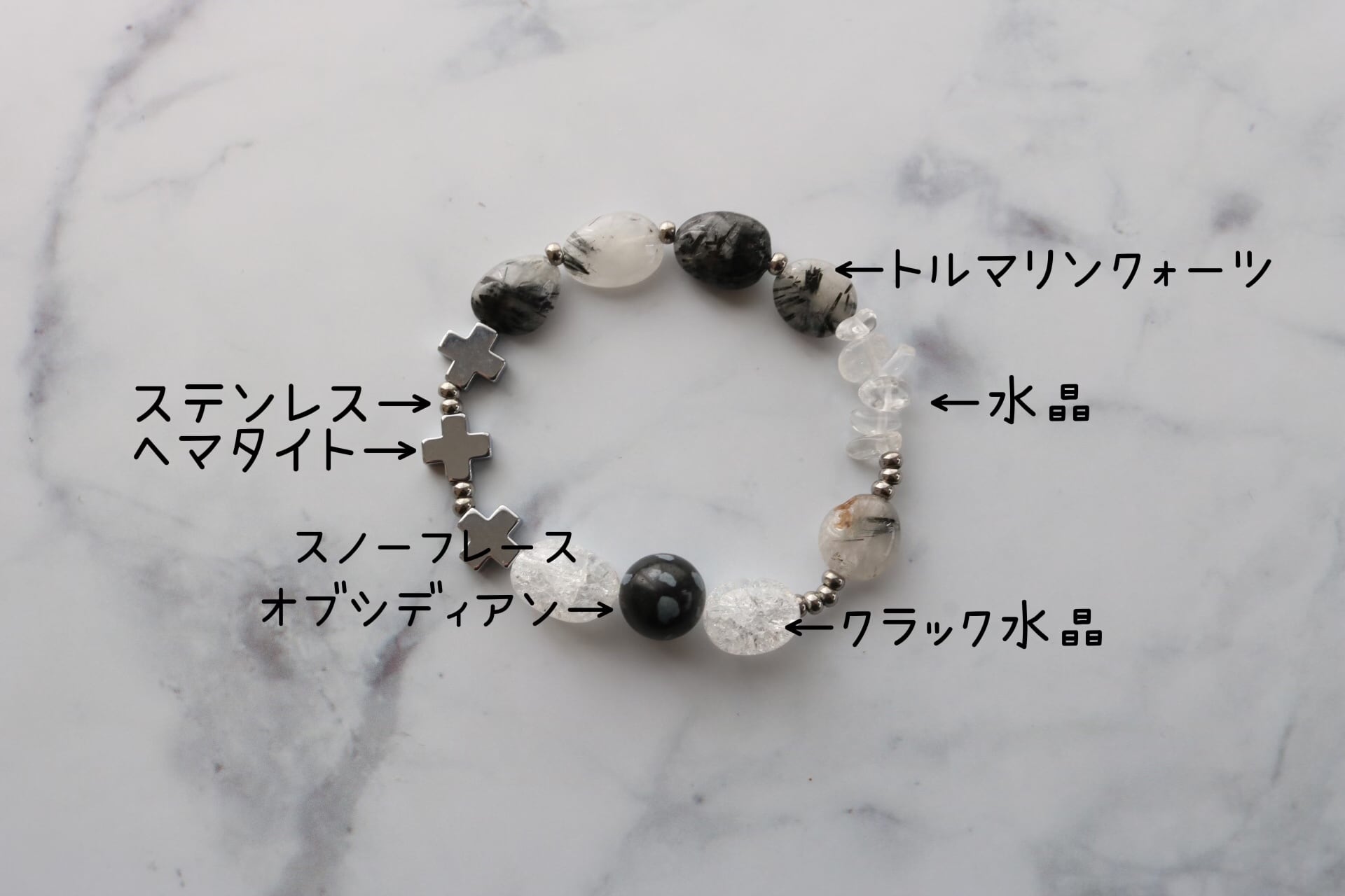 トルマリンクォーツ×水晶×クラック水晶×スノーフレースオブシディアン×ヘマタイト×ステンレス ブレス